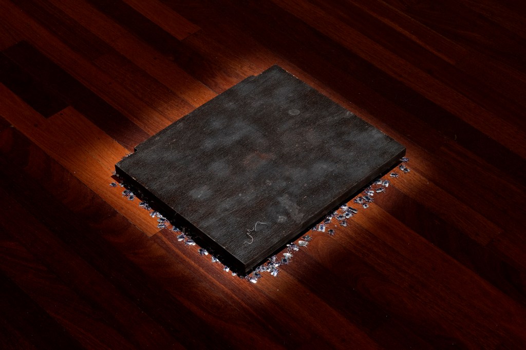 Scorched Timber, Varnish, Aluminium, Alcohol-Based Ink, Graphite